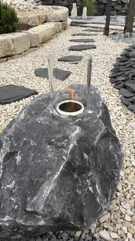 Unsere Feuersteine bringen Lagerfeuerromantik in Ihren Garten. Findlinge, Monolithen oder Säulen sind mit einem sauberen geruchlosen und weitestgehend rußfreiem Dekofeuer versehen. Als Brennmittel dient Bioethanol, welches in einem Edelstahleinsatz entzündet wird. Auch als Kombination von Feuer & Wasser, also Brunnensteine mit Feuereinsatz, sind sie erhältlich. Neben unserer Lagerware dürfen Sie sich auch vor Ort einen Stein aussuchen, den Sie dann per „Upgrade“ zu einem Feuerstein machen können. Dazu werden die Steine mittels Spezialbohrung für einen Edelstahleinsatz mit Glas versehen. Der Einsatz ist der Brennbehälter für das Brennmittel Bioethanol.