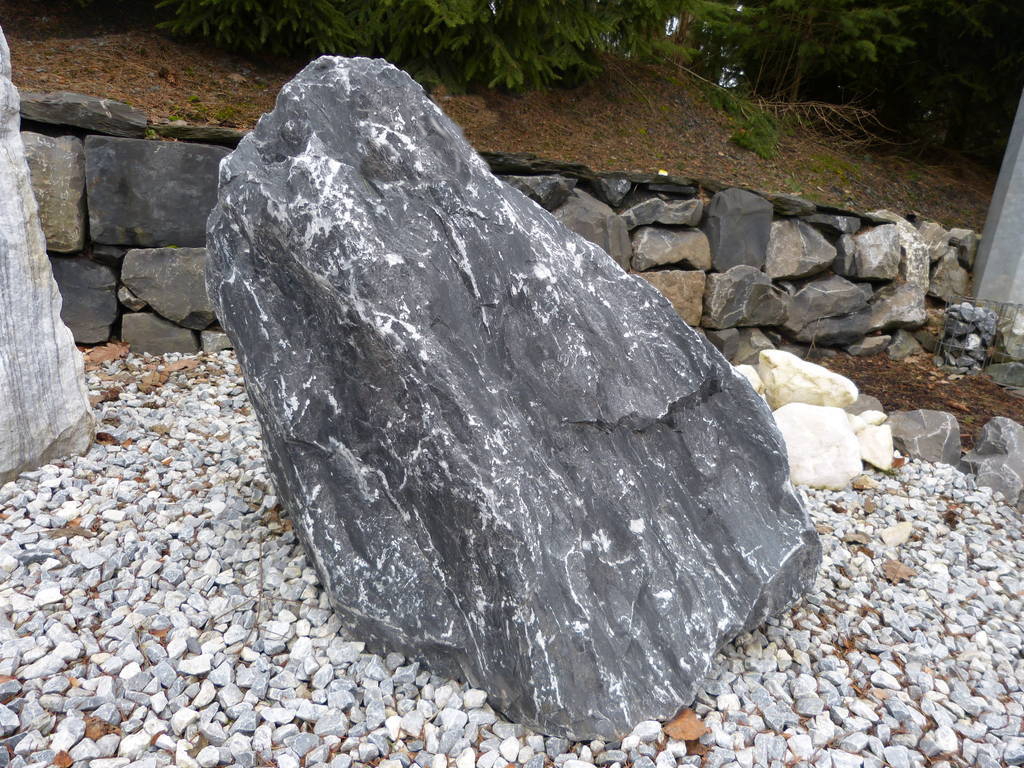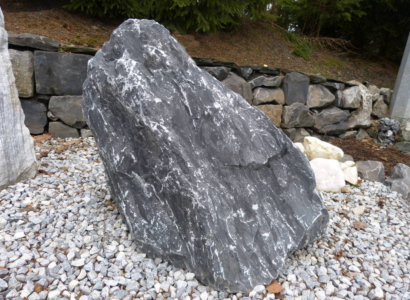 Besonders in modernen Gartenanlagen sind diese Findlinge ein Dauerbrenner. Eine sehr dunkle fast schwarze Grundfarbe wird von kleinen weißen Adern durchzogen. Durch natürliche Lagen des Gesteins haben die Findlinge oft relativ glatte Standflächen, so dass sie sich besonders gut aufstellen lassen. Der Stein ist sehr witterungsbeständig und robust, dadurch wird er gerne als Brunnenstein verwendet.