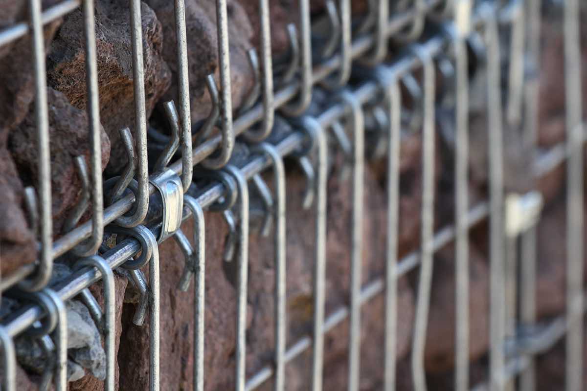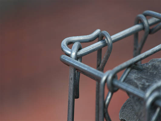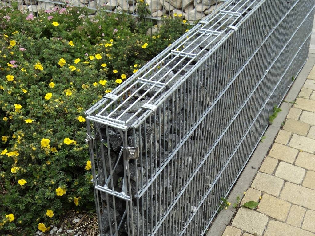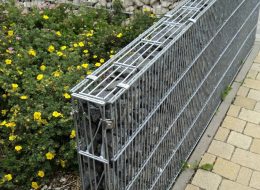 Stabilisiert werden die Gabionen im Inneren mit Abstandhaltern: Hierbei handelt es sich um Rundstäbe, die an den Enden genau auf die Länge bzw. Breite der Körbe umgebogen sind. Die Abstandhalter werden in die Matten der Gabionen eingehängt. Beim Befüllen verteilt sich so der Druck der Steine gleichmäßig im Korb und die Abstandhalter verhindern, dass die Körbe zu sehr ausbeulen. Auch bei anderen quaderförmigen Korbvarianten ändert sich in der Regel nur das Verschlusssystem. So werden R-Gabionenkörbe mit einem Steckverschluss zusammengebaut. Die einzelnen Matten haben über die Kanten verteilt sogenannte „Schlaufen“ (umgebogene und verschweißte Rundstäbe). Über die Schlaufen und die mitgelieferten Steckstäbe werden die Körbe so zusammengesetzt. Grundsätzlich sieht die R-Gabione etwas edler und robuster aus und ist in der Regel auch etwas teurer.