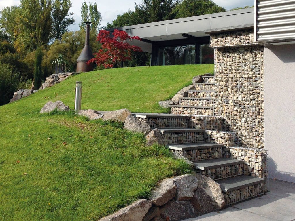 - Steinkörbe als Hangbefestigung oder Stützmauer haben eine natürlichere Optik als einfache Betonwinkelelemente oder Ähnliches