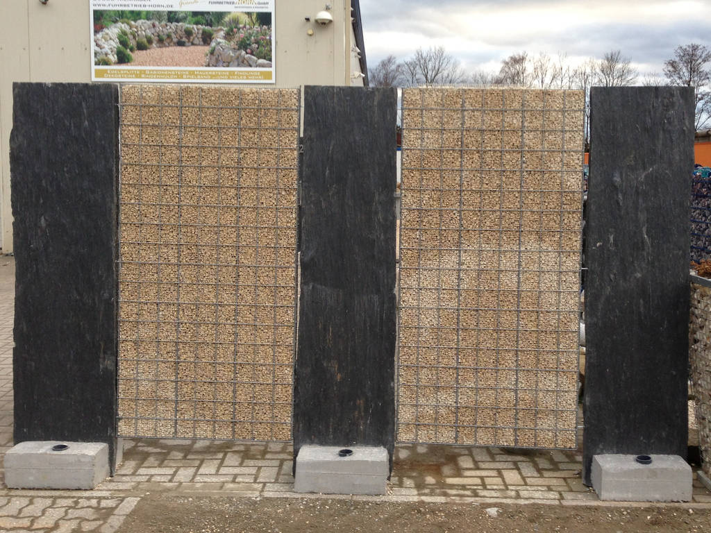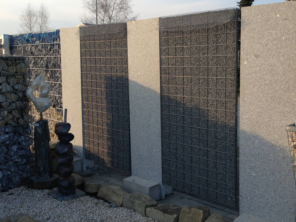 Unsere Splitt Gabionenwände aus Edelstahl sind besonders elegant und langlebig. Ob zwischen Corten Sichtschutzwänden oder Steinbretten, die Einsatz- und Montagemöglichkeiten sind vielseitig. Die geringe Tiefe von nur 4 cm und eine Maschenweite von 100 x 15 mm ermöglichen das Einfüllen von mittleren Splittkörnungen in 16-32 mm oder 16-22 mm Erhältlich sind die Gabionenwände in Höhen von 120-250 cm wahlweise mit Pfosten zum einbetonieren, Fußplatten zum Aufdübeln oder mit Haltern für Steinwände. Die Standardlänge der Elemente liegt bei 126 cm (Mitte Pfosten gemessen).