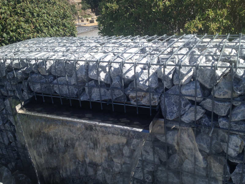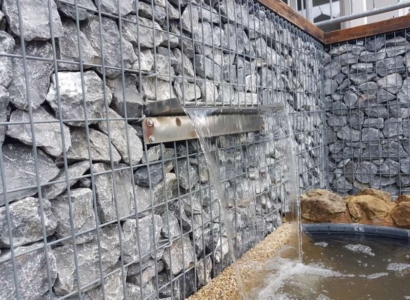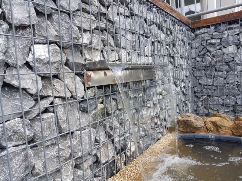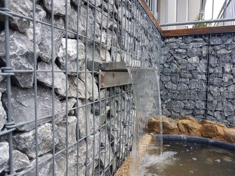 Dieser Wasserfall wurde von uns selbst konstruiert. Die Gabionen sind flexibel in der Größe und im Einsatz. Die Gabionen werden vorgerichtet und die Wasserfall-Platte eingearbeitet. Sie können sich Ihren Wasserfall also in Höhe und Gesteinsfarbe selbst zusammen bauen. Lassen Sie sich über Details von uns beraten!