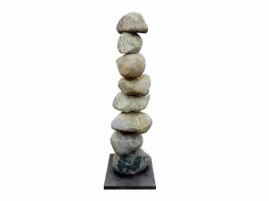 Zu Kieseln verabreitete Granit, Kalk und Marmorbrocken die mittels Bohrung auf einen Spies aufgereiht sind. Außergwöhnliche Skulpturen die dem Garten das gewisse Etwas verleihen. Eine Platte am Fuss sorgt für besseren Stand im Garten.