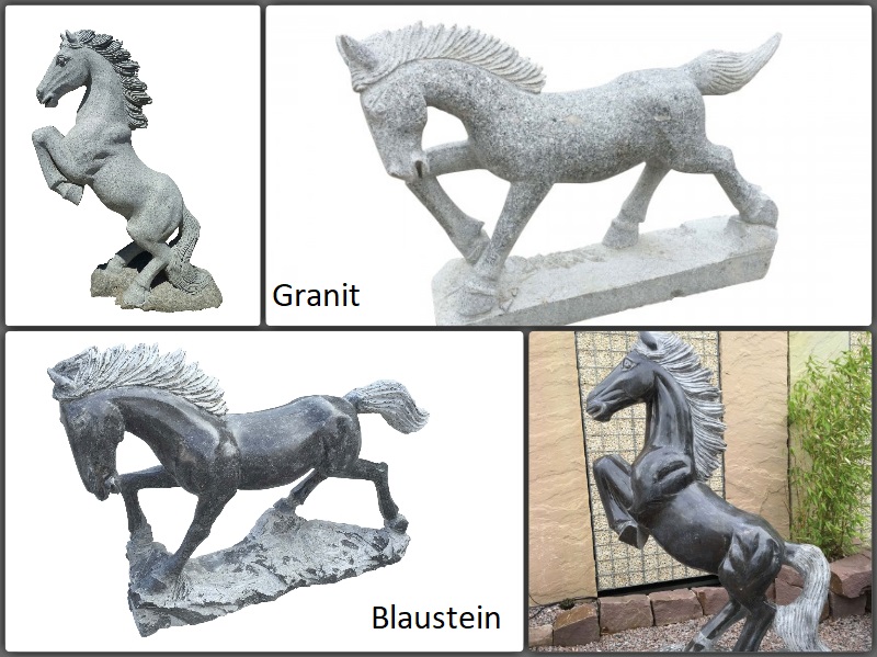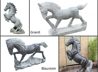 Dekorative Pferdeskulpturen mit Standfuß werten Ihren Garten optisch und künstlerisch auf. Aus echten Granit oder Blaustein verarbeitet ist jedes Stück ein Unikat. Die Pferde aus Naturstein sind in verschiedenen Größen und Formen erhältlich: