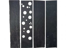 Große Bretter aus Schiefer. Hervorragend geeignet als Sichtschutzelement auch zwischen Gabionenzaun. Die klassischen schwarzen Schieferbretter erleben gerade eine Renaissance im Garten. Der Schiefer ist besonders dunkel, teils fast schwarz, und hat durch seine matte Oberfläche ein elegantes Auftreten. Ein ganz besonderen Look erhalten die Bretter durch dekorative Lochbohrungen.