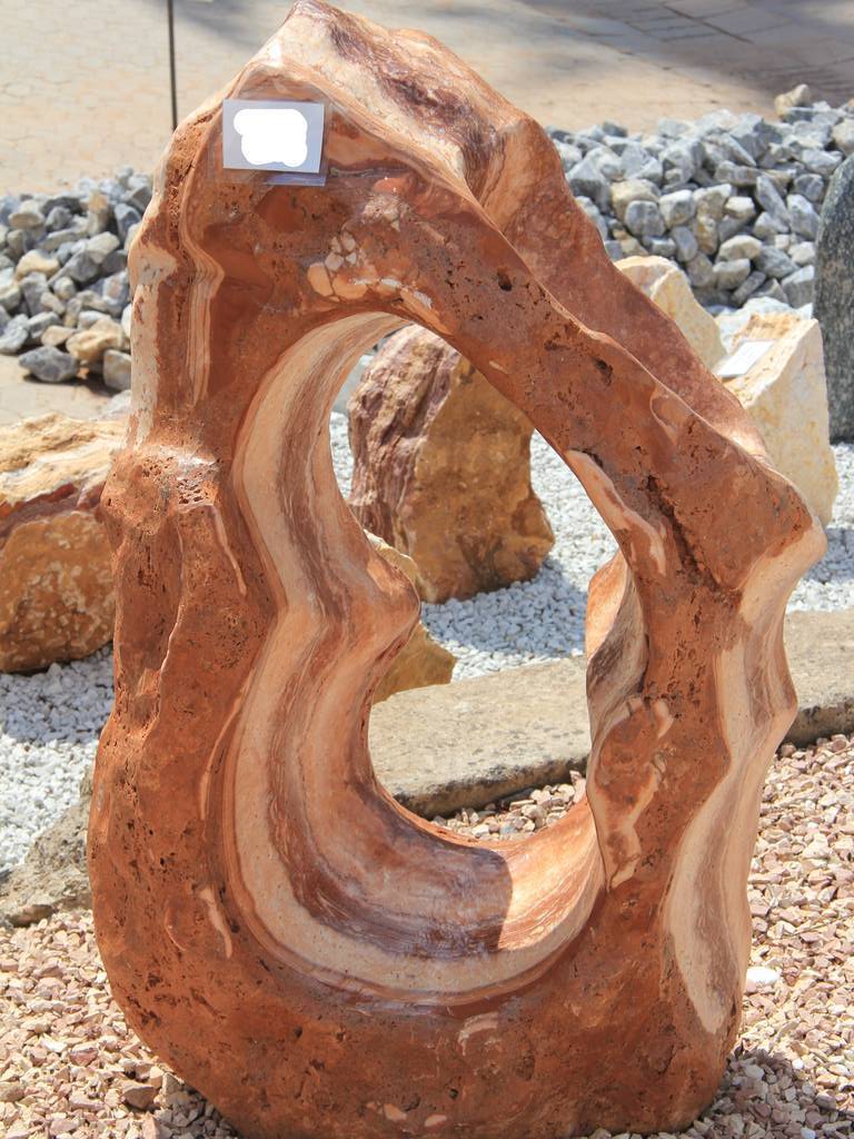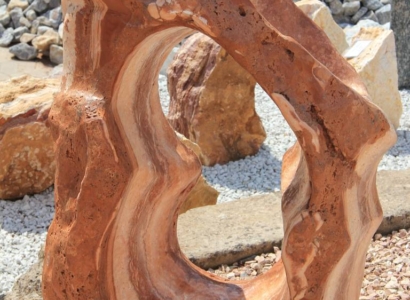 Die mit sanften Kurven geschnittenen Marmor-Monolithen in orange passen schön zu mediterranen Gärten. Es handelt sich um echte Steinmetzarbeit.