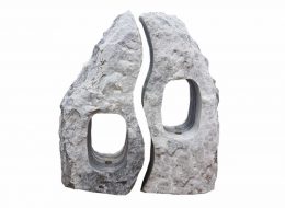 Die grau-blauen Marmormonolithen haben eine edle und frische Optik zugleich. Wer moderne Gärten in Grautönen mag aber die nötige Frische vermisst ist mit diesen Ziersteinen gut beraten. Die Monolithen bestehen wie der Name schon sagt immer aus zwei zusammengehörigen Teilen wobei die Innenseite entsprechend dem Gegenstück gesägt ist. Die Steine bilden z.B. mit dunklen Splitten oder Zierkiesen einen schönen Kontrast. Der gesägte Fuß sorgt für besseren Stand im Garten. Die Premiumausführung hat zusätzlich zwei große Aussparungen die zudem mit einer Brunnenbohrung versehen wird, die Höhe liegt bei 130cm.