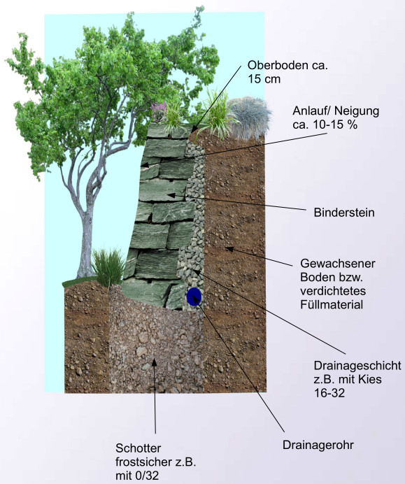 Trockenmauern bis Kniehöhe ca. 1,00 m Höhe brauchen in der Regel kein besonderes Fundament. Soll die Mauer höher werden sollte, bei Höhen bis 1,50 m ein frostsicherer Unterbau aus Schotter 0-32 oder 0-56 mm (i.d.R. min. 40 cm) eingebaut und sorgfältig verdichtet werden. Über 1,50 m empfehlen wir unbedingt eine statische Berechnung zu machen, in der die Gegebenheiten vor Ort sowie die Lastwirkungen berücksichtigt werden. Die Fundamentbreite und die Mauertiefe richten sich ebenfalls nach der Höhe der Mauer. Als Faustregel sollte die Breite des Mauerfußes der Natursteinmauer mindestens 1/2 – 1/3 der Höhe betragen und das Fundament sollte nochmals 10-15 cm breiter sein als die Trockenmauer.