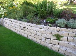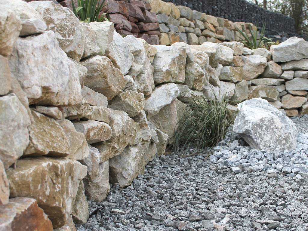 Der Verwendungszweck einer Trockenmauer bestimmt ganz maßgeblich die Auswahl der richtigen Trockenmauersteine oder Bruchsteine. Unsere Bruchsteine und Mauersteine eignen sich hervorragend für Deko-Trockenmauern und zum Verblenden bzw. Befestigen von Hang oder Aufschüttung. Wenn Sie aber mit größeren Erdlasten oder dergleichen zu kämpfen haben und diese mit einer Trockenmauer abfangen möchten, sollten Sie folgendes beachten: Die herkömmlichen Trockenmauersteine und Verblendsteine, wie Sie auch im „Steinakzente“-Sortiment zu finden sind, eignen sich in der Regel nicht um große Lasten abzufangen. Hier wird je nach Vorhaben eine entsprechend breitere Hintermauerung benötigt. Alternativ können auch sogenannte Schwerlaststeine oder Findlinge mit einem gewissen Eigengewicht und einer Mindesteinbautiefe eingesetzt werden, die Sie aber natürlich auf Anfrage ebenfalls bei uns erhalten können. Viele Gärtner lösen das Problem auch, indem Sie hinter der Trockenmauer schichtweise betonieren und so eine Stützmauer hochziehen. Alternativ können Sie auch den Erddruck des Hangs mit Betonwinkeln abfangen und anschließend mit einer Trockenmauer verkleiden. Bei freistehenden Trockenmauern muss in der Regel doppelwandig gemauert werden, was natürlich doppelte Menge und doppelter Aufwand bedeutet. Oft ist hier eine Lösung mit einer Gabionenwand günstiger und leichter zu bewerkstelligen. Generell empfehlen wir bei statisch relevanten Maßnahmen die Trockenmauer zumindest unter Anleitung eines Experten zu bauen.