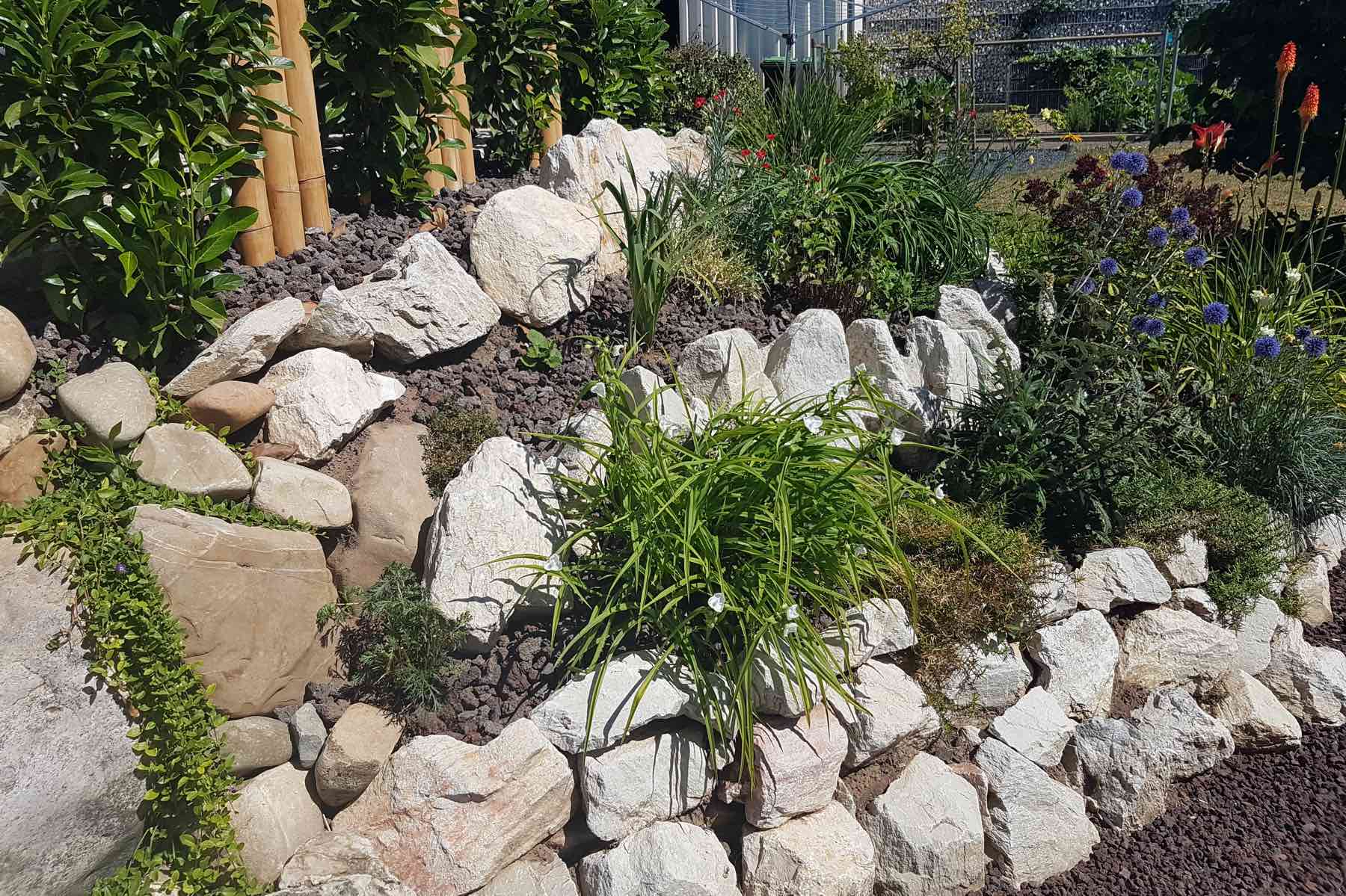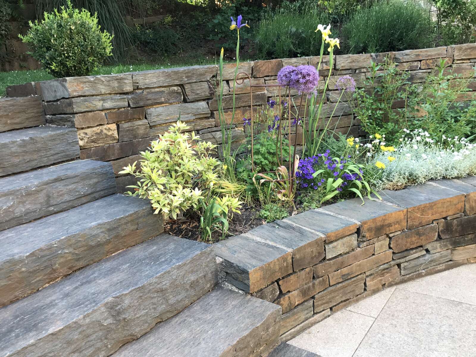 Als Bruchsteine bezeichnet man große gebrochene Natursteine, die häufig für Trockenmauern, Hangverkleidungen oder den Teichbau im Garten eingesetzt werden. Sie eignen sich aber auch zu Dekozwecken wie der Gestaltung von Hügellandschaften. Mauersteine bzw. Trockenmauersteine werden am häufigsten für typische Trockenmauern oder als Abgrenzung von Steingärten eingesetzt, da sie im Gegensatz zu Bruchsteinen meist vorbehandelt (gespalten oder gesägt) oder sortiert sind und dadurch eher einer Quaderform entsprechen. Bei der traditionellen Zyklopenmauer, oft auch Friesenwall genannt, werden große runde Kieselsteine eingesetzt. Eine Natursteinmauer als Trockenmauer wird, wie der Name schon sagt, ohne Mörtel und Beton gesetzt: Dadurch wirkt sie sehr natürlich und lockert das Gesamtbild Ihres Steingartens erheblich auf. Trockenmauern speichern Wärme und sorgen so für ein optimales Kleinklima für Steinkraut und andere Steingartenpflanzen. Trockenmauern im Garten werden eingesetzt als Stützmauern und Dekomauern an Hängen und Terrassen, als Abgrenzung oder auch als Einfassung von Hochbeeten.