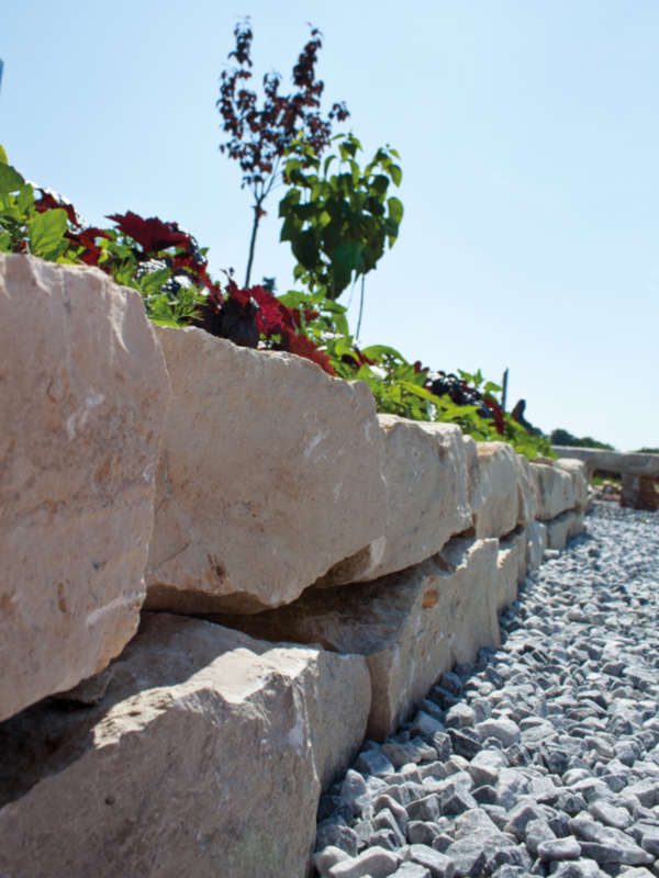 Der gespaltene Mauerstein aus Jura passt hervorragend in mediterrane Gärten oder Anlagen mit warmer Farbgebung. Vor allem als Beeteinfassung ist er sehr begehrt. Das weiche Gestein lässt sich gut Nachbearbeiten.