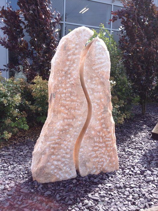 Die grau-blauen Marmormonolithen haben eine edle und frische Optik zugleich. Wer moderne Gärten in Grautönen mag aber die nötige Frische vermisst ist mit diesen Ziersteinen gut beraten. Die Monolithen bestehen wie der Name schon sagt immer aus zwei zusammengehörigen Teilen wobei die Innenseite entsprechend dem Gegenstück gesägt ist. Die Steine bilden z.B. mit dunklen Splitten oder Zierkiesen einen schönen Kontrast. Der gesägte Fuß sorgt für besseren Stand im Garten. Die Premiumausführung hat zusätzlich zwei große Aussparungen die zudem mit einer Brunnenbohrung versehen wird, die Höhe liegt bei 130cm.
