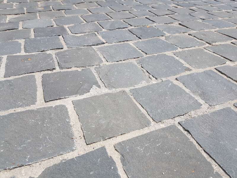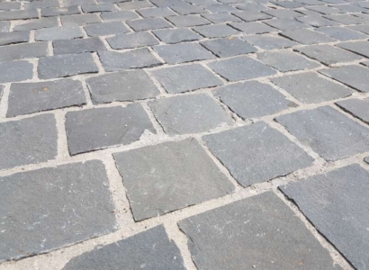 Die edle Version unseres grauen Basaltpflaster. Oben und unten gesägt, Seiten gespalten. Die Oberfläche ist geflammt und gebürstet.