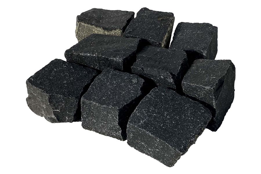 Ein dunkles grob gespaltenes Kopfsteinpflaster aus der Türkei in typischer Basalt Optik, hin und wieder mit den typischen braunen Stellen.