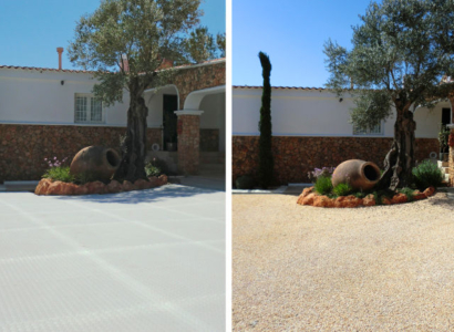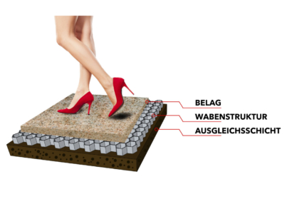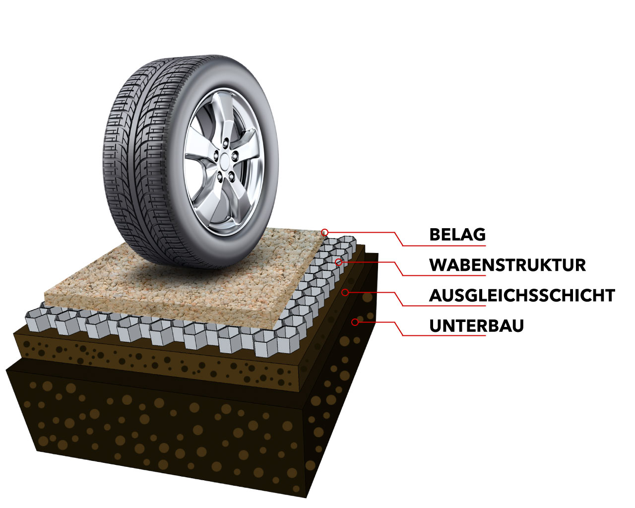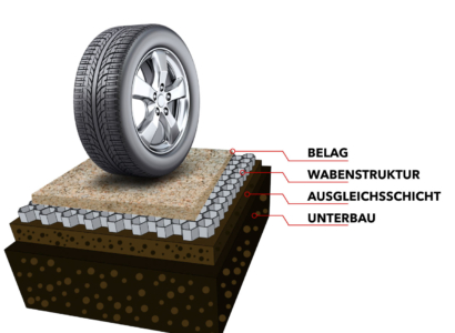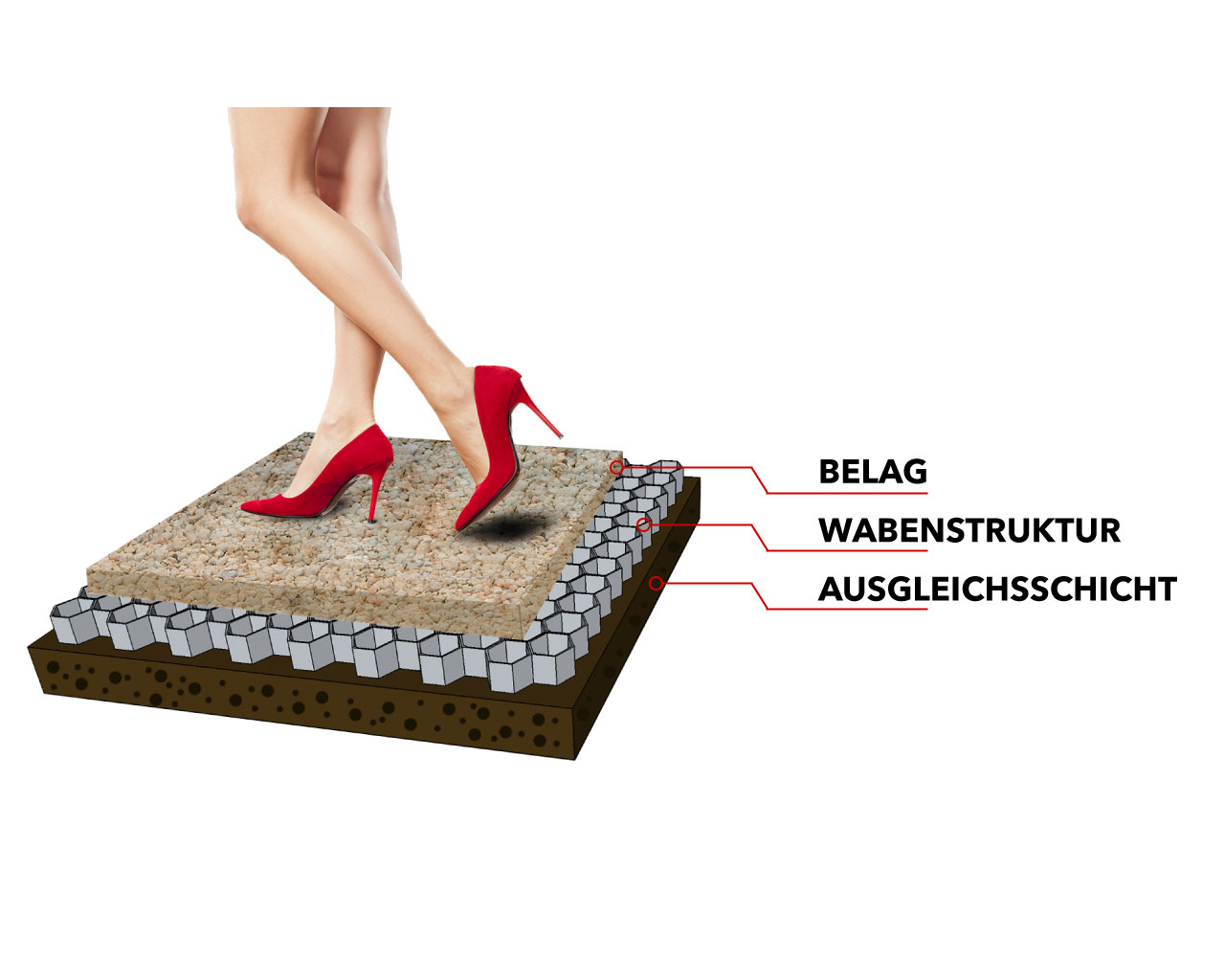 – Wasserdurchlässig: Keine Pfützenbildung, keine Schlaglöcher, keine Furchen und keine versiegelten Flächen.
