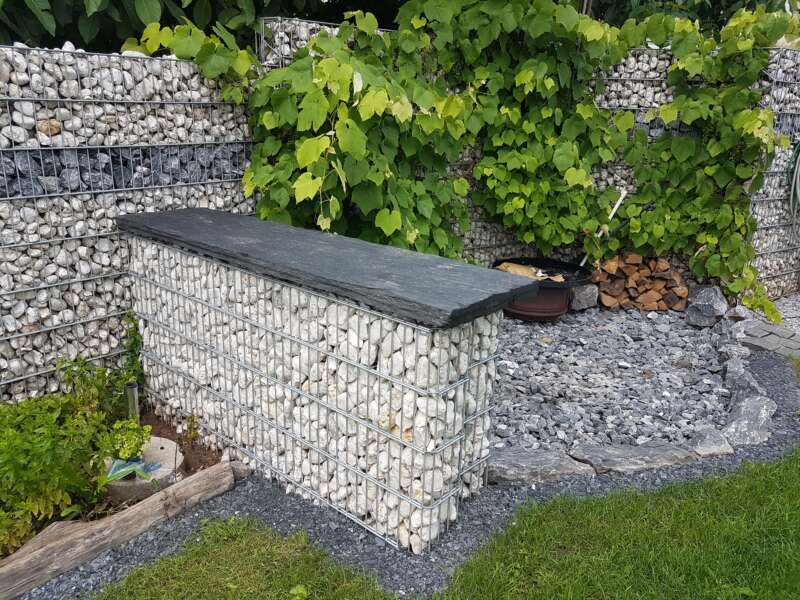 Ein ausgefallenes Möbelstück aus einer Gabione. Wir fertigen die Theke in der gewünschten Größe und mit der gewünschten Steinplatte nach Wahl (Schiefer, Gneis, Granit oder Sandstein). Die Theken sind mit extra dünnen Wänden (20 cm) und so auf der Rückseite ausgespart für extra Stauraum. Für einen sicheren Stand werden Kantrohre zum Einbetonieren der Theke mitgeliefert. Durch ein ausgeklügeltes System kann die Platte optimal ausgerichtet werden. Die Nutzungsmöglichkeiten sind enorm, auch Spezialausführungen mit Durchlässen z.b. für Wasseranschlüsse sind möglich.
