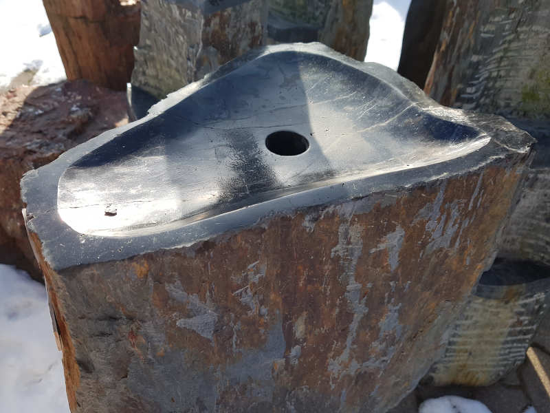 Schöne Schieferbrunnen in typischer Rostoptik. Für den Wasserauslauf ist ein Kelch eingefräst und poliert. Durch die Fräsung läuft das Wasser, bei richtiger Ausrichtung, verteilt über den gesamten Stein. Er ist ein toller Blickfang gerade auf dunklem Splitt oder Kies kommt der rötliche Rostton besonders gut zur Geltung.