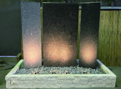 Dieser Wasserfall mit Brettern aus Blaustein ist der absolute Höhepunkt in jedem Bereich. Er eignet sich sowohl für den Innen- als auch für den Außenbereich. Im Innenbereich wird er in Kombination mit einem Wasserbecken gerne als Arrangement in großen Hallen oder einzeln auch als Raumtrenner für Luftfeuchtigkeit eingesetzt. Auch im Außenbereich ist diese Wand immer wieder schön anzusehen. In den meisten Fällen wird die Wand in ein Becken gestellt und kommt vor allem mit hellem Gestein vollends zur Geltung.