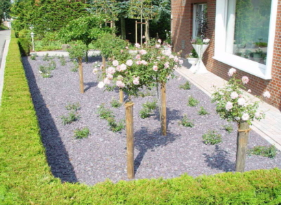 Die klassischen schwarzen Chips aus Schiefer erleben gerade eine Renaissance in der Gartengestaltung. Der Schiefersplitt ist besonders dunkel und wirkt durch seine matte Oberfläche noch einmal edler. Eine besonders gute Figur macht er im Zusammenspiel mit Elementen in Grautönen.