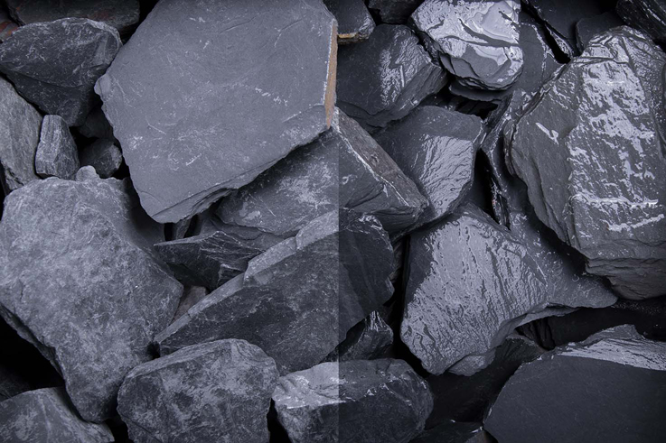Die klassischen schwarzen Chips aus Schiefer erleben gerade eine Renaissance in der Gartengestaltung. Der Schiefersplitt ist besonders dunkel und wirkt durch seine matte Oberfläche noch einmal edler. Eine besonders gute Figur macht er im Zusammenspiel mit Elementen in Grautönen.