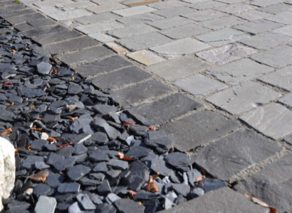 Die klassischen schwarzen Schieferchips erleben gerade wieder einen Aufschwung in der Gartengestaltung. Er ist besonders dunkel und wirkt durch seine matte Oberfläche sehr elegant. Eine besonders gute Figur macht er als Einfassung zu grauen Elementen.